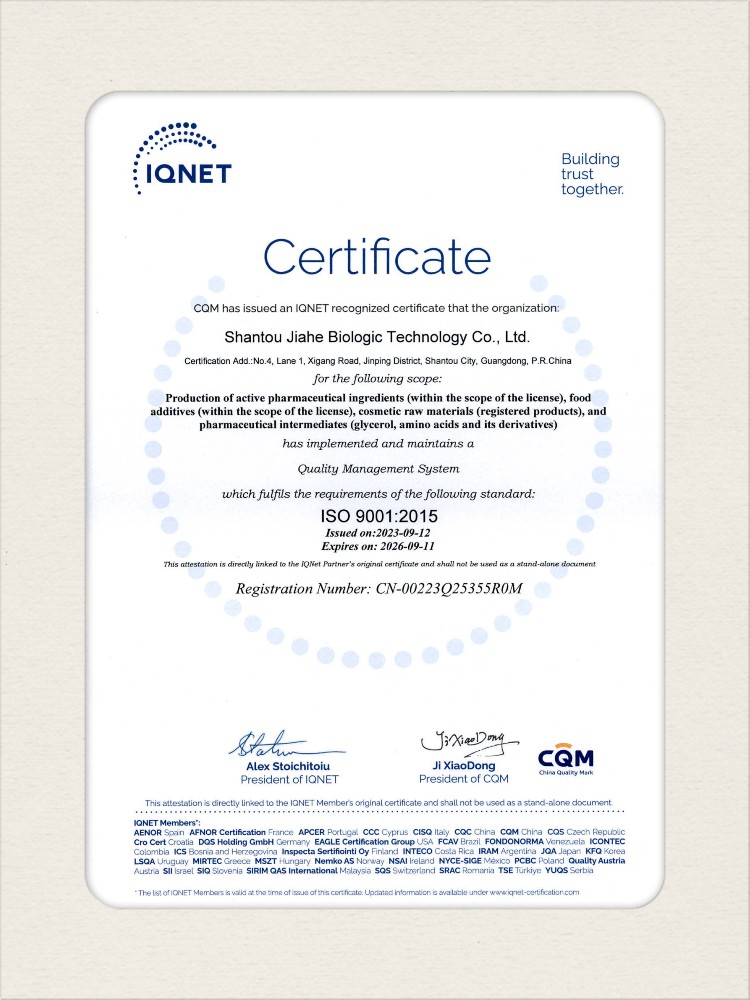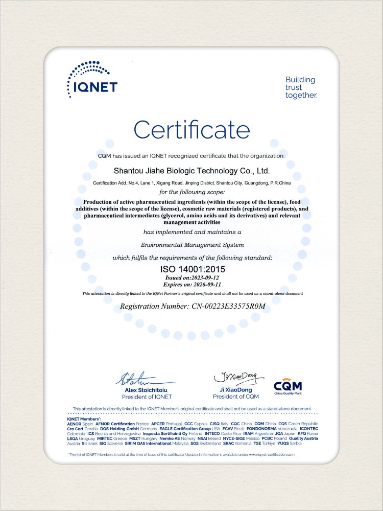 汕頭佳禾生物科技有限公司是一家致力于氨基酸及其衍生物研發(fā)、生產(chǎn)和銷售的國家高新技術(shù)企業(yè),先后通過了國家藥品GMP認證,ISO9001質(zhì)量體系認證、ISO14001環(huán)境管理體系認證。目前,公司擁有“廣東省專精特新中小企業(yè)”、“廣東省氨基酸產(chǎn)品工程技術(shù)研究中心”、“汕頭市生物發(fā)酵工程技術(shù)研究開發(fā)中心”、“汕頭市知識產(chǎn)權(quán)優(yōu)勢企業(yè)”、“多項國家發(fā)明專利”、“廣東省守合同重信用企業(yè)”等多項資質(zhì)和榮譽,旗下“佳禾牌”系列產(chǎn)品已成為原料藥行業(yè)知名品牌。 新泰市佳禾生物科技有限公司成立于2012年8月,注冊資金2億元,公司位于山東泰安新泰市新汶工業(yè)園區(qū),是國 家級高新技術(shù)企業(yè)、山東省“專精特新”企業(yè)、山東省制造業(yè)單項冠軍企業(yè)、泰安市科技型中小企業(yè)、泰安市農(nóng)業(yè)產(chǎn)業(yè)化龍頭企業(yè)、中國生物發(fā)酵產(chǎn)業(yè)協(xié)會理事單位。